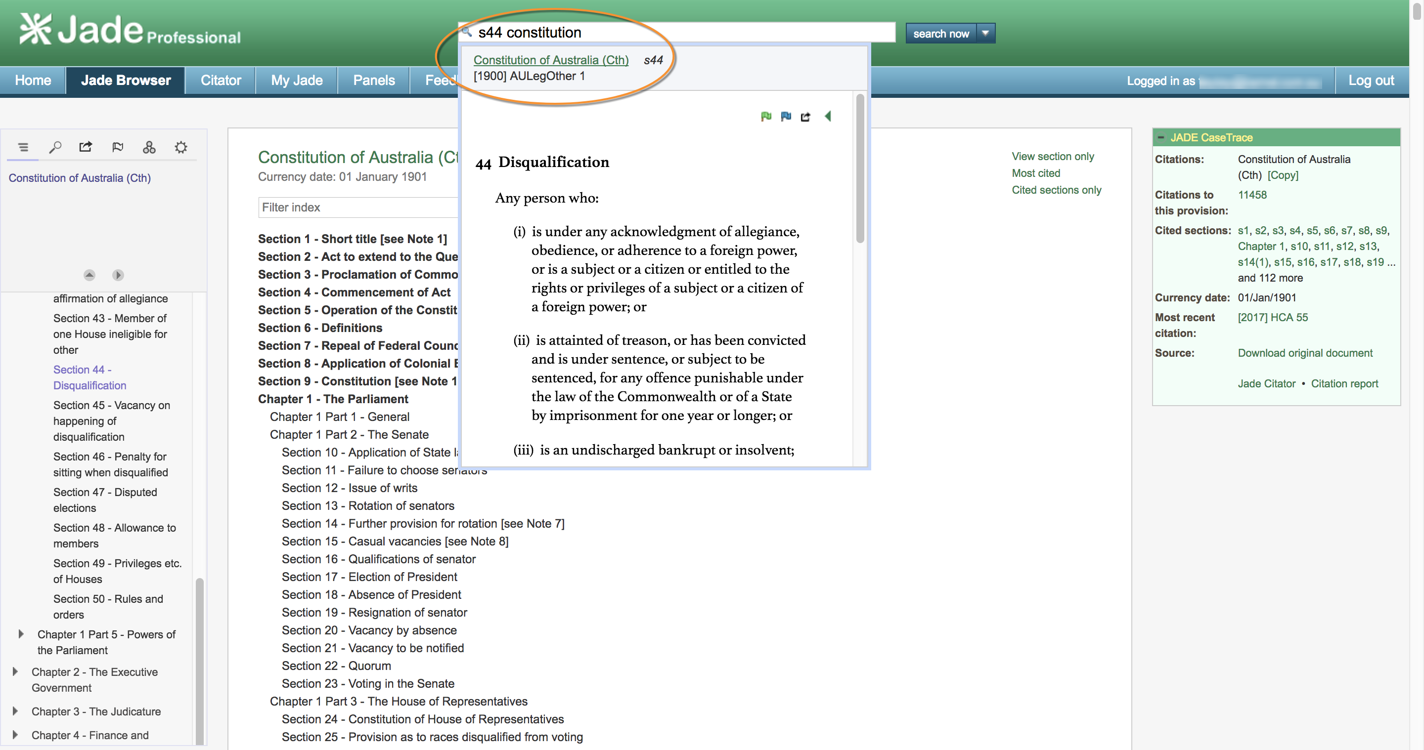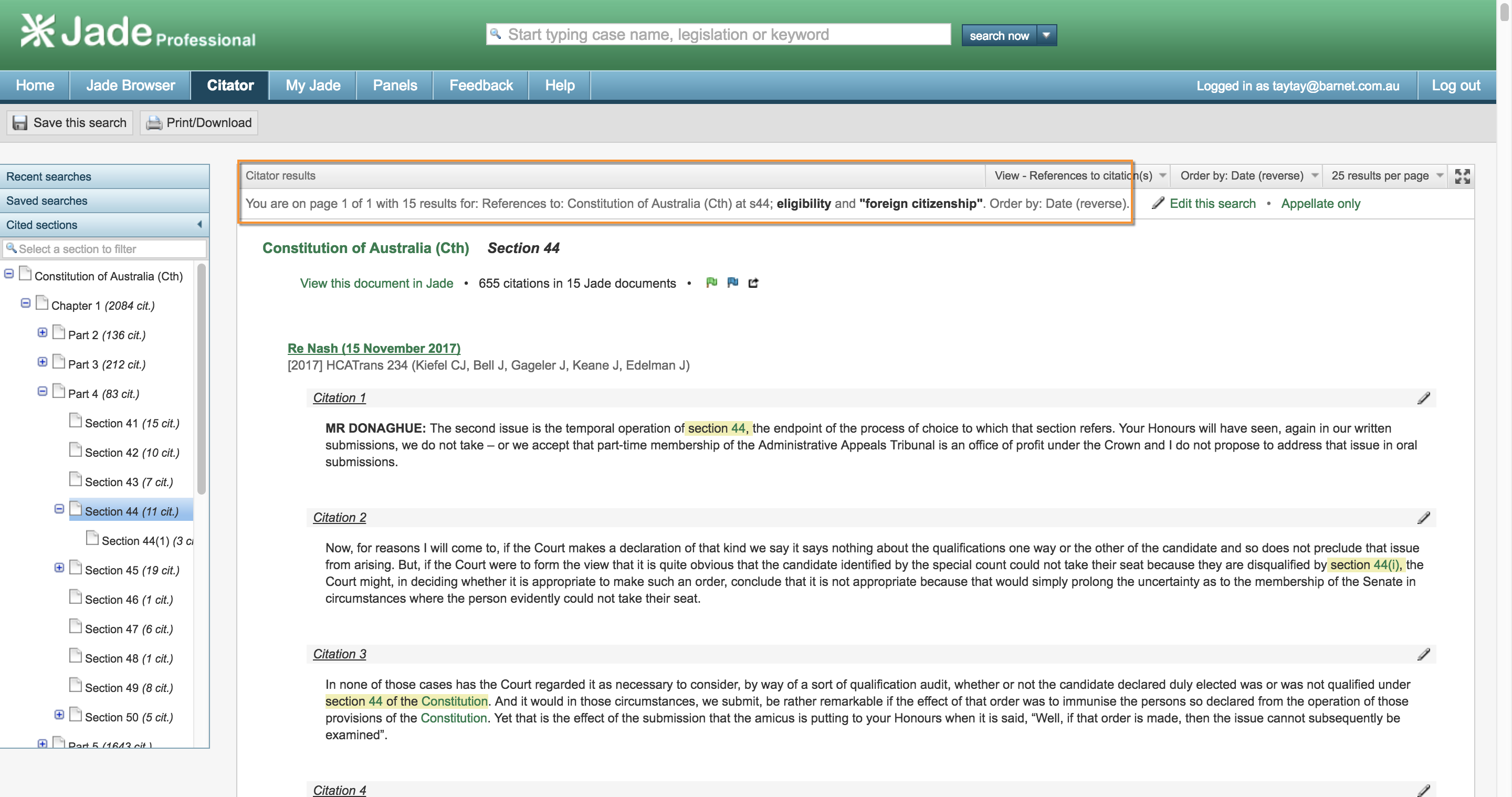 Step 2: click on the Jadeclip … that innocuous little green clip on the right-hand side of the page … and unlock the power of JADE Professional! Find the latest case which considers section 44 of the Constitution and jump straight to the citations of that section in those cases. Set an alert to be notified of any cases decided on this particular section between now and the election.