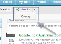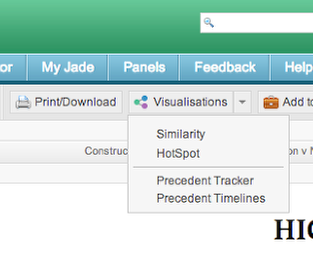 Visualisations. The legal system is a complex web of precedent, jurisdiction and statute that has evloved over centuries. It is often difficult to quickly see how all of these parts relate to one another. Visualisations allow you to see the relationships in the legal system quickly and in a visually impressive way. What makes it powerful is that JADE lets you drill down on the graphic and see the words are responsible for the colours. The option to generate visualisations appears throughout JADE and can be accessed from multiple screens.