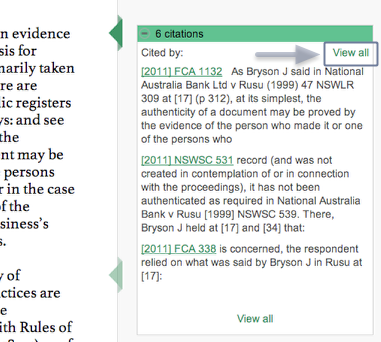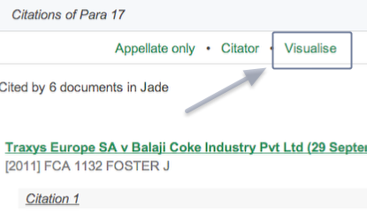 JADE will let you drill down and visualise how a paragraph of a case or section of an act has been cited. You can do this whilst you are scrolling through a case by clicking view all on the citation pop-up on the right hand side – This will then give you the options to visualise see below.